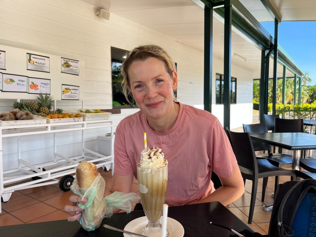 En ananasodling utanför Balgal Beach. Ett eukalyptusträd och Richard.På ”Frosty Mango” beställde jag en iskaffe till min medhavda macka. Vi köpte också mangoslush, torkad mango och morotskaka, så det blev ett fantastiskt fika.