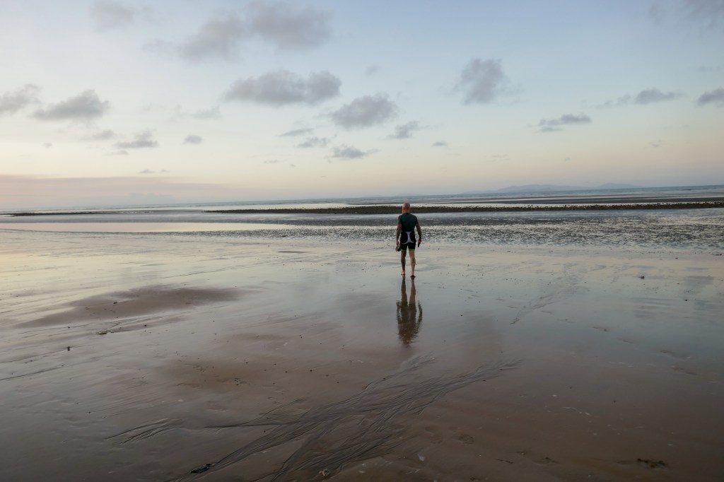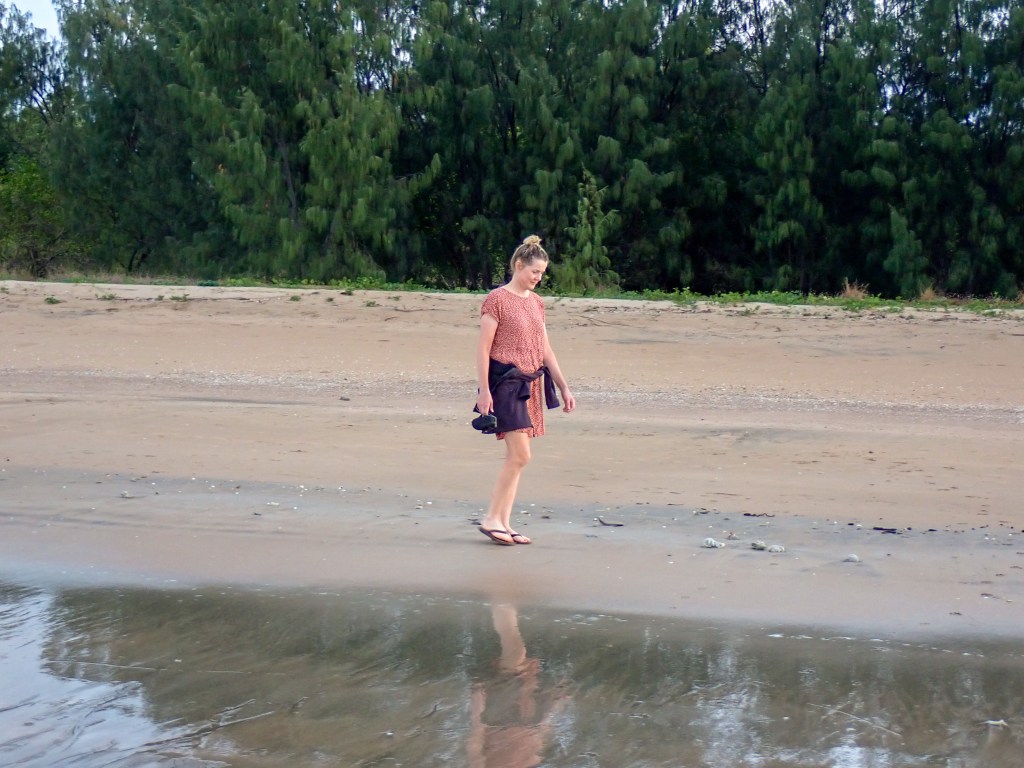 I lilla Balgal Beach bor vi på ett mysigt ställe, synd att vi stannar så kort tid. Vi gick ner till stranden efter middag. Nu har vi kommit in i krokodilland och vi uppmanades att inte gå nära vattenbrynet.