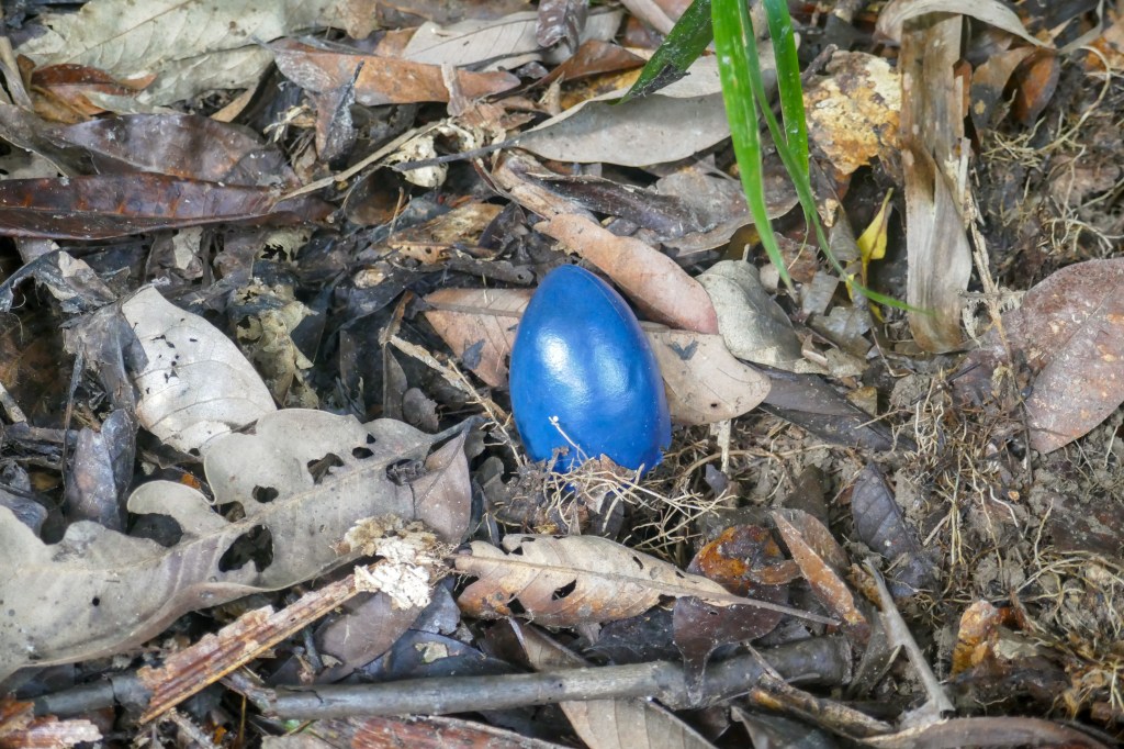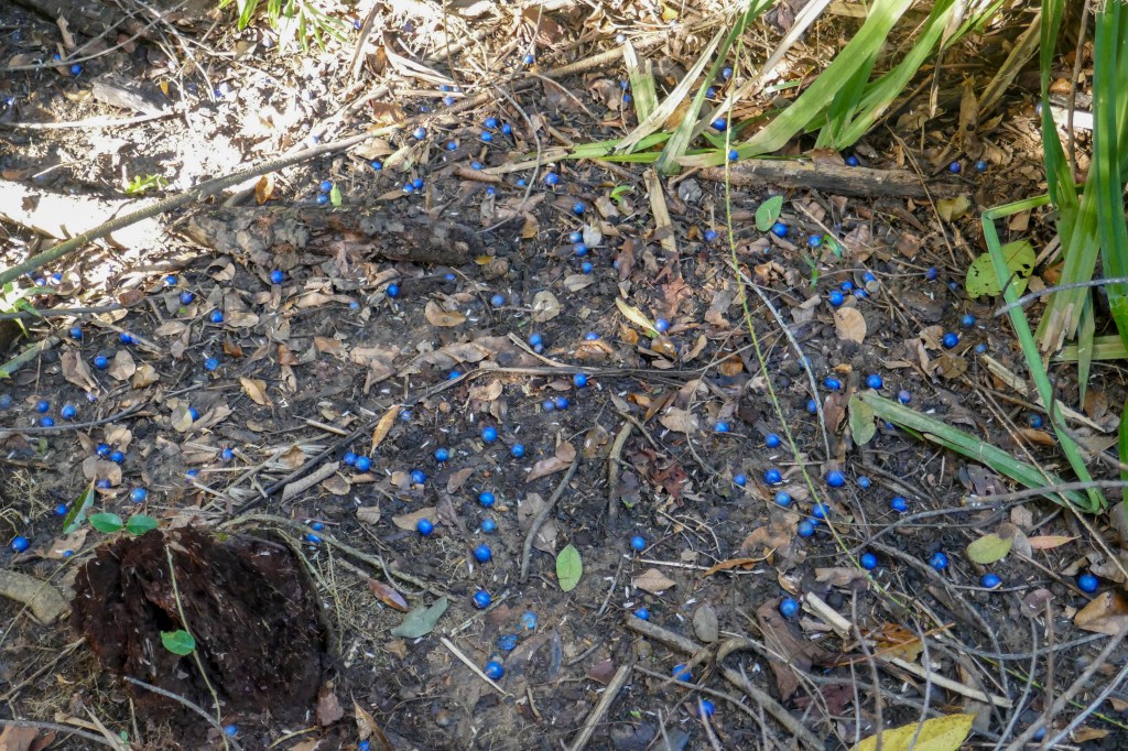 ”Cassowary plums” som fallit till marken är några av de frukter som kasuaren äter. De stora frukterna ser ut som blå ägg (lite större än vanliga hönsägg).