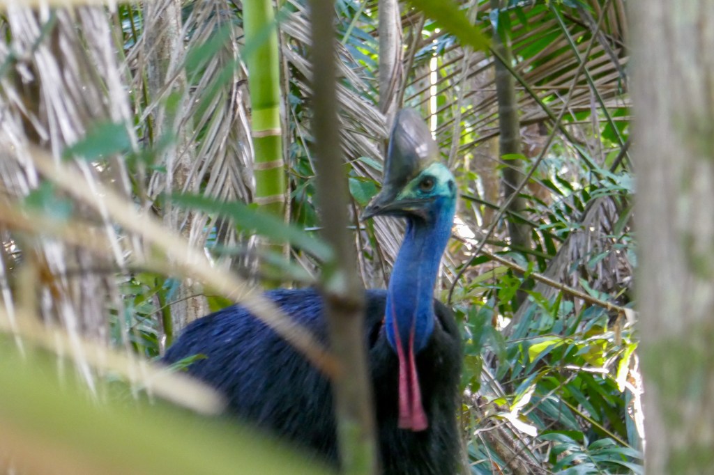 Vi har haft lyckan att få se flera hjälmkasuarer. Den är en stor (honorna är i genomsnitt 175 cm höga) marklevande fågel, släkt med kivifågel, emu och struts. Kasuarhonan är större och mer attraktiv än hanen (vi tror att det här är en hona). Hanen ruvar äggen och uppfostrar kycklingarna.