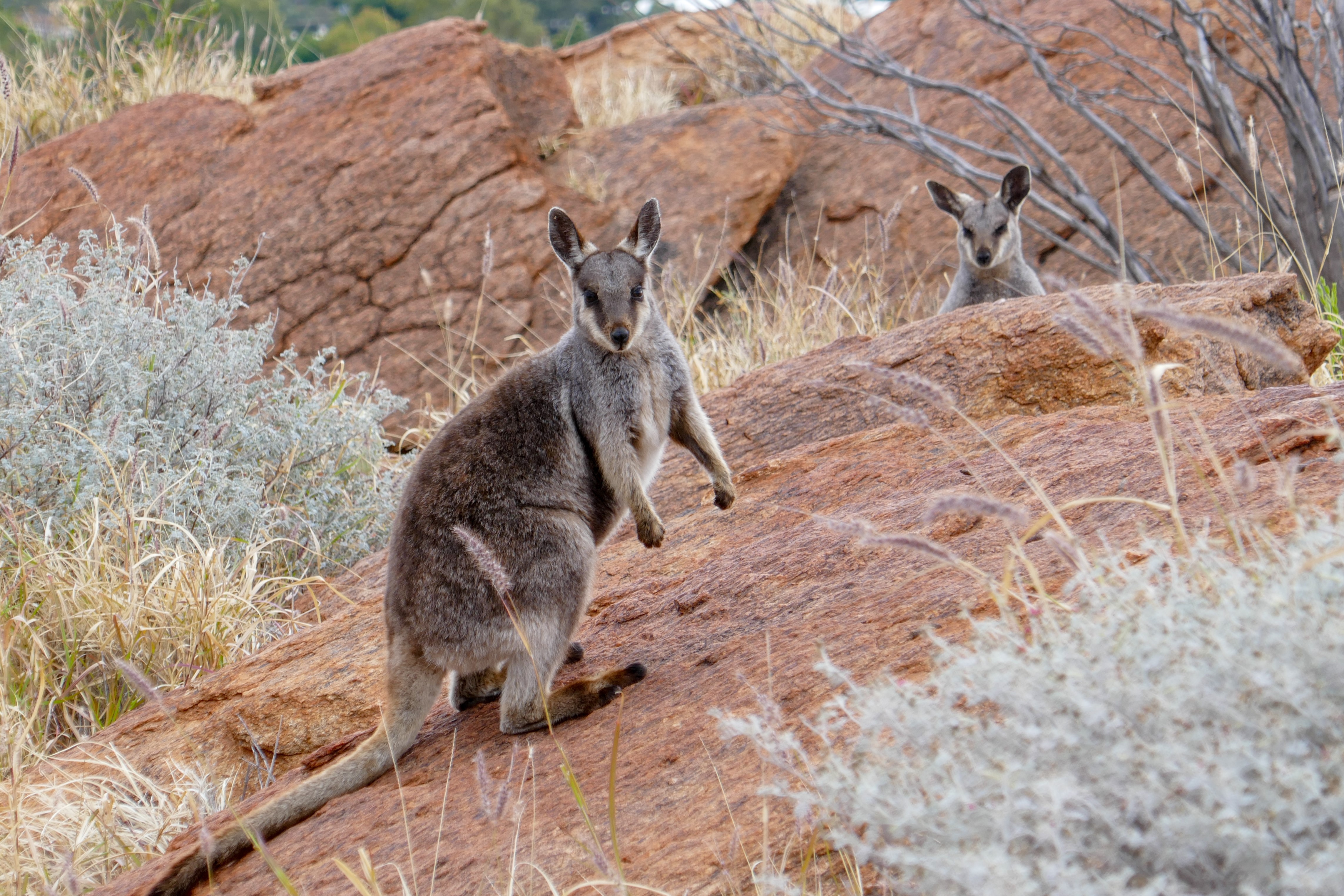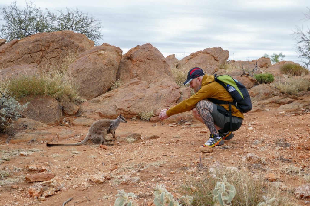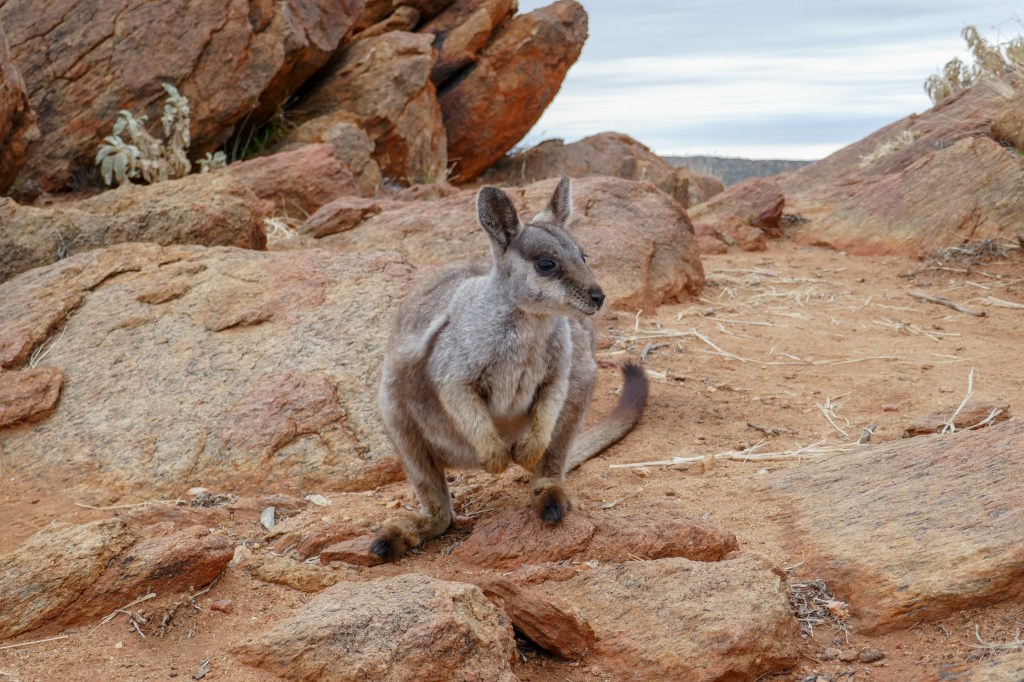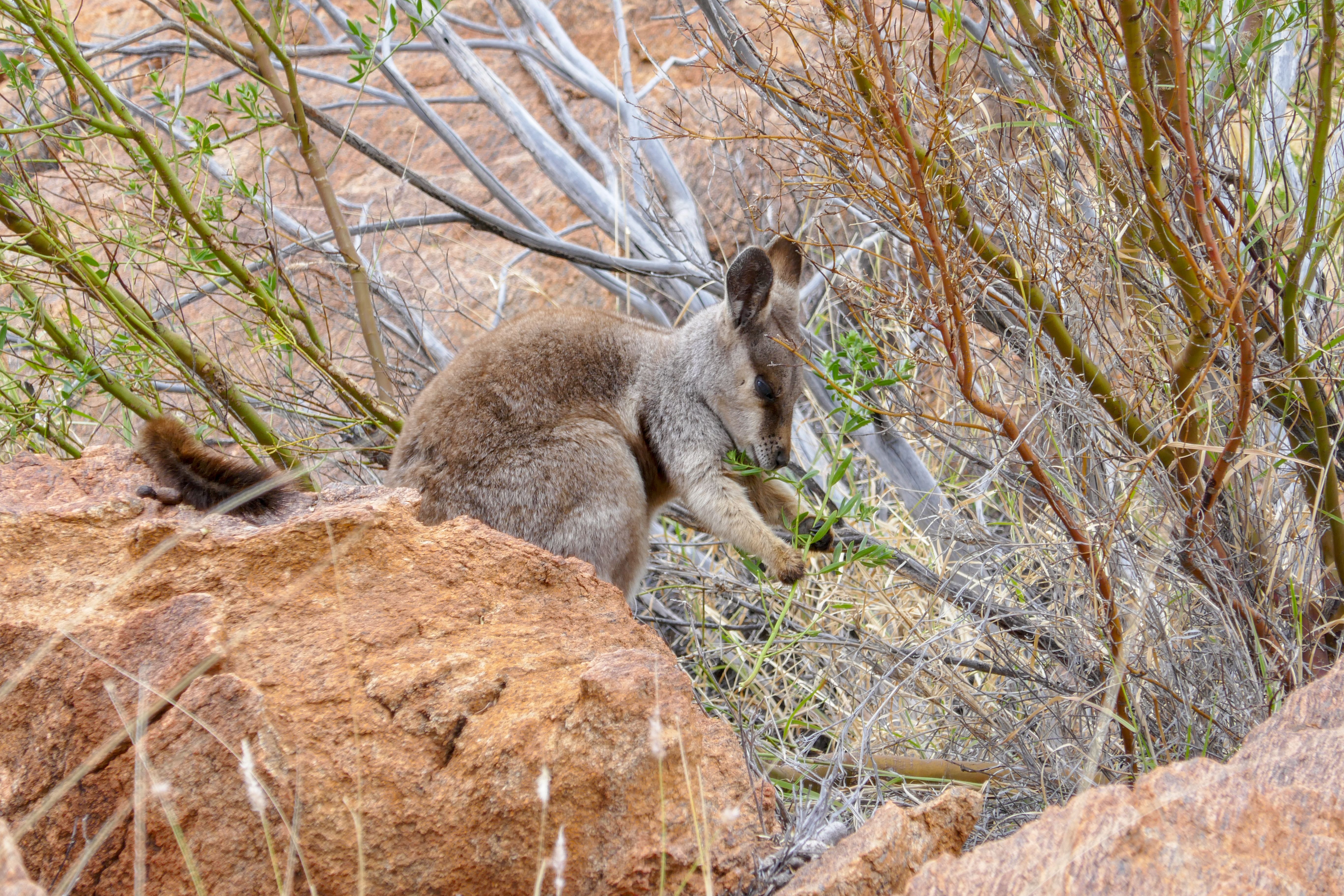 På skyltar i trädgården läste vi att en population av ”Black-footed rock wallaby” (en sorts klippkänguru) levde på kullarna. De är nattaktiva djur, men kanske var det den mulna och svala dagen som fick dem att fortfarande vara framme och äta gräs och örter när vi kom. Det var helt makalöst att se dessa fantastiska djur – varken jag eller Richard kunde sluta titta (eller fotografera). Helt magiskt!!